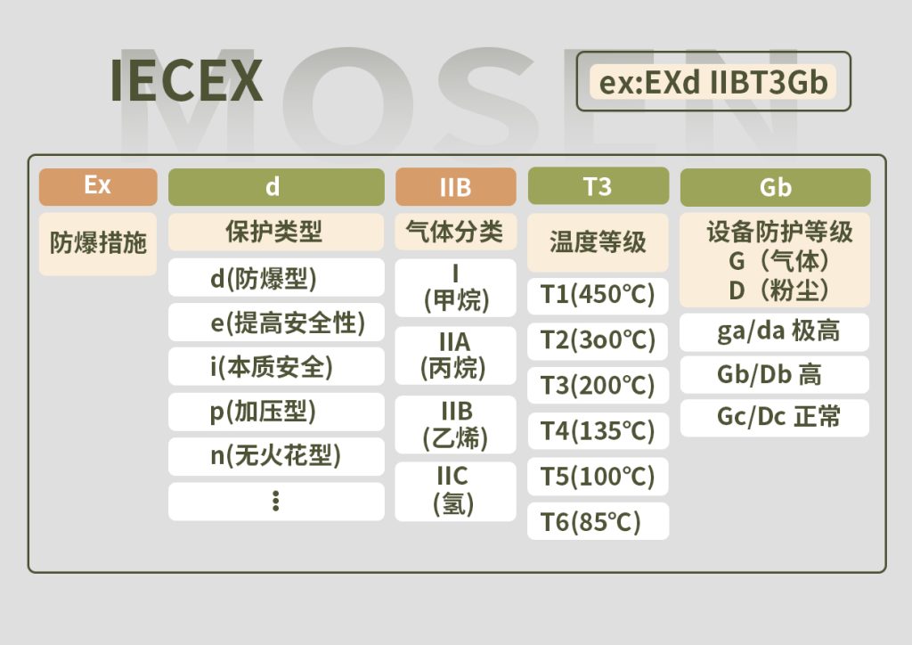 • IECEx (国际电工委员会防爆标准): 由国际电工委员会(IEC)制定,是国际和全球性的防爆认证标准。它有助于降低制造商的测试和认证成本,并允许在不同国家采用相同的标准。IECEx 的认证过程比 ATEX 更为严格。